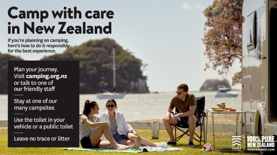 Tourism New Zealand launched an expanded version of their successful campaign to support and manage the camping system in New Zealand. Find out more about this work. The campaign encourages people to stay at campsites and campgrounds with facilities, and for those who choose to camp on public land it guides them on how to do this responsibly. The campaign includes advertising that targets campers via social media and Wi-Fi at 16 key camping spots, posters, brochures, digital screens and guide to great camping behaviour.